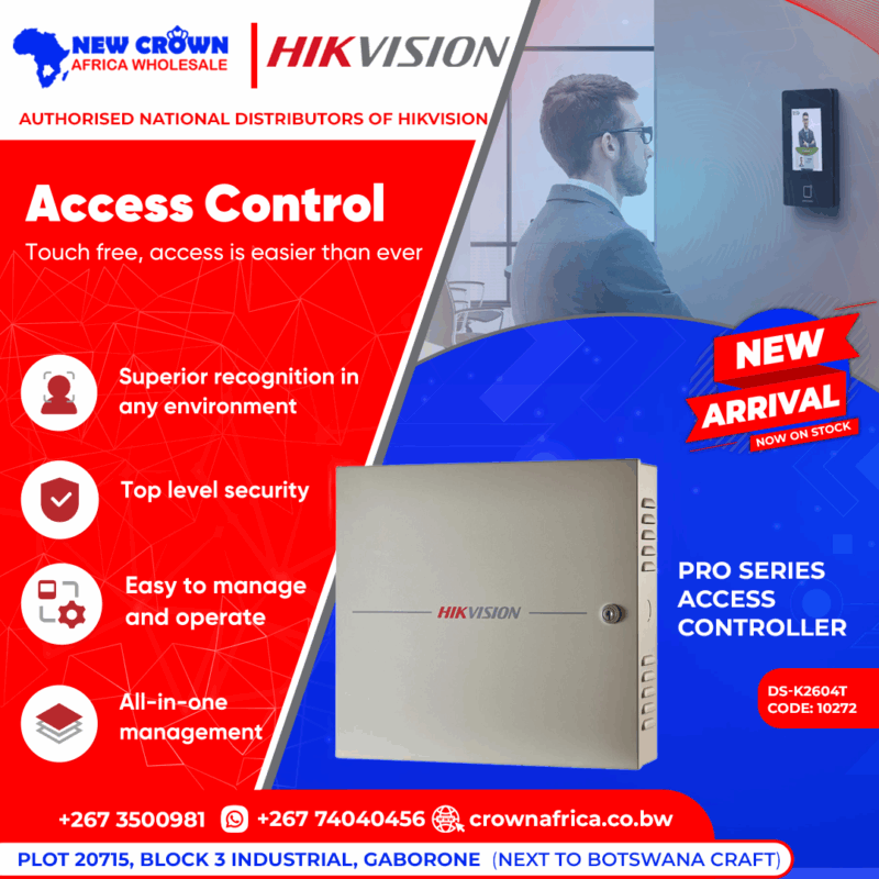 At Crown Enterprises T/A New Crown Africa, we are proud Authorized National Distributor for Hikvision in Botswana. crownafrica.co.bw This means we bring you the latest, industry-leading access control solutions — with local support, supply, and installation — tailored for homes, offices, institutions, and commercial properties across the country.