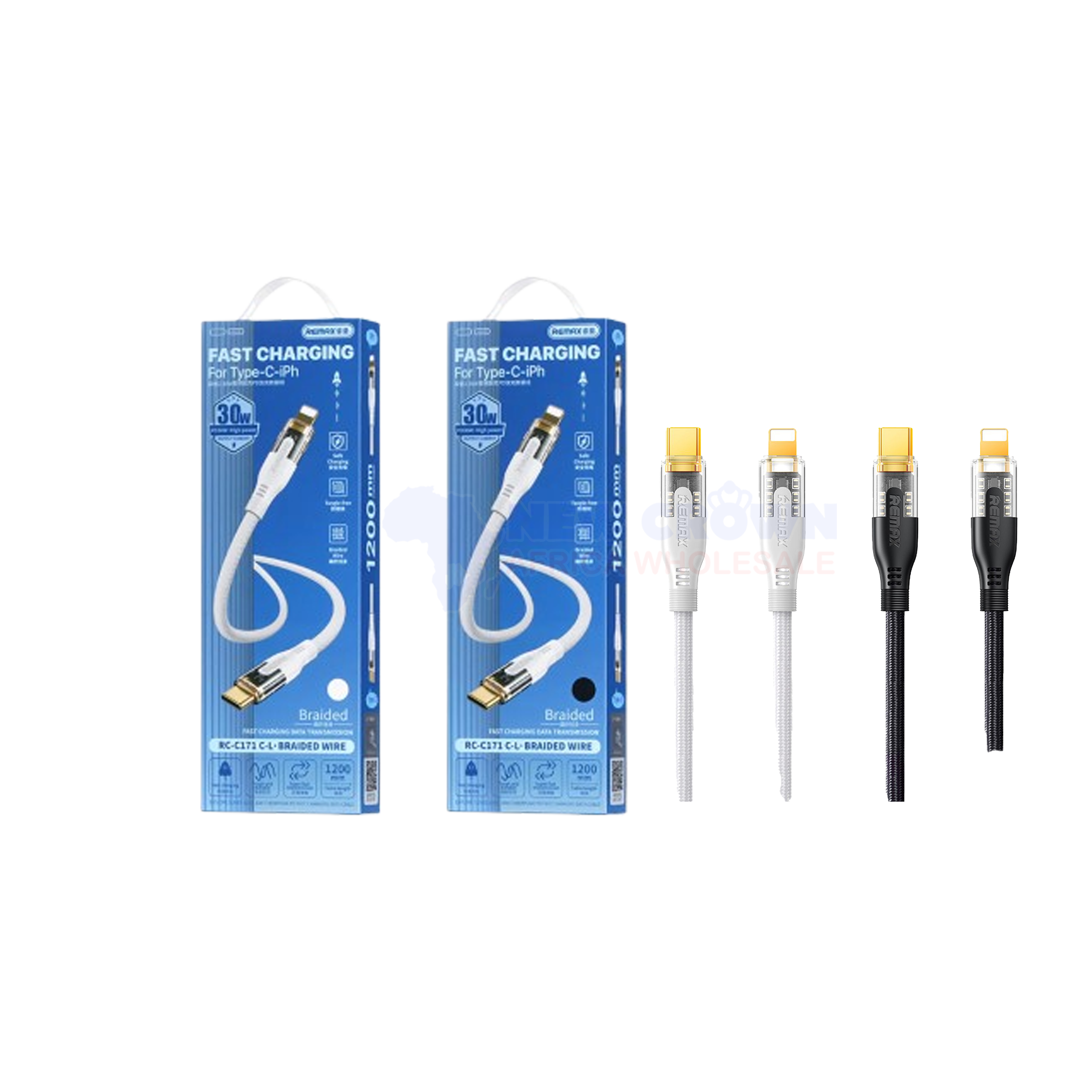 REMAX RC-C171 C-L Type-C Data Cable (Braided Wire) is a high-quality charging and data transfer solution built for durability, speed, and compatibility. Designed with a strong braided exterior, this cable offers extended lifespan and consistent performance—making it the ideal choice for wholesalers, retailers, mobile shops, and corporate buyers in Gaborone, Botswana.