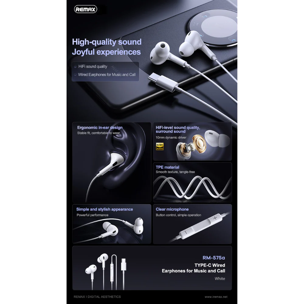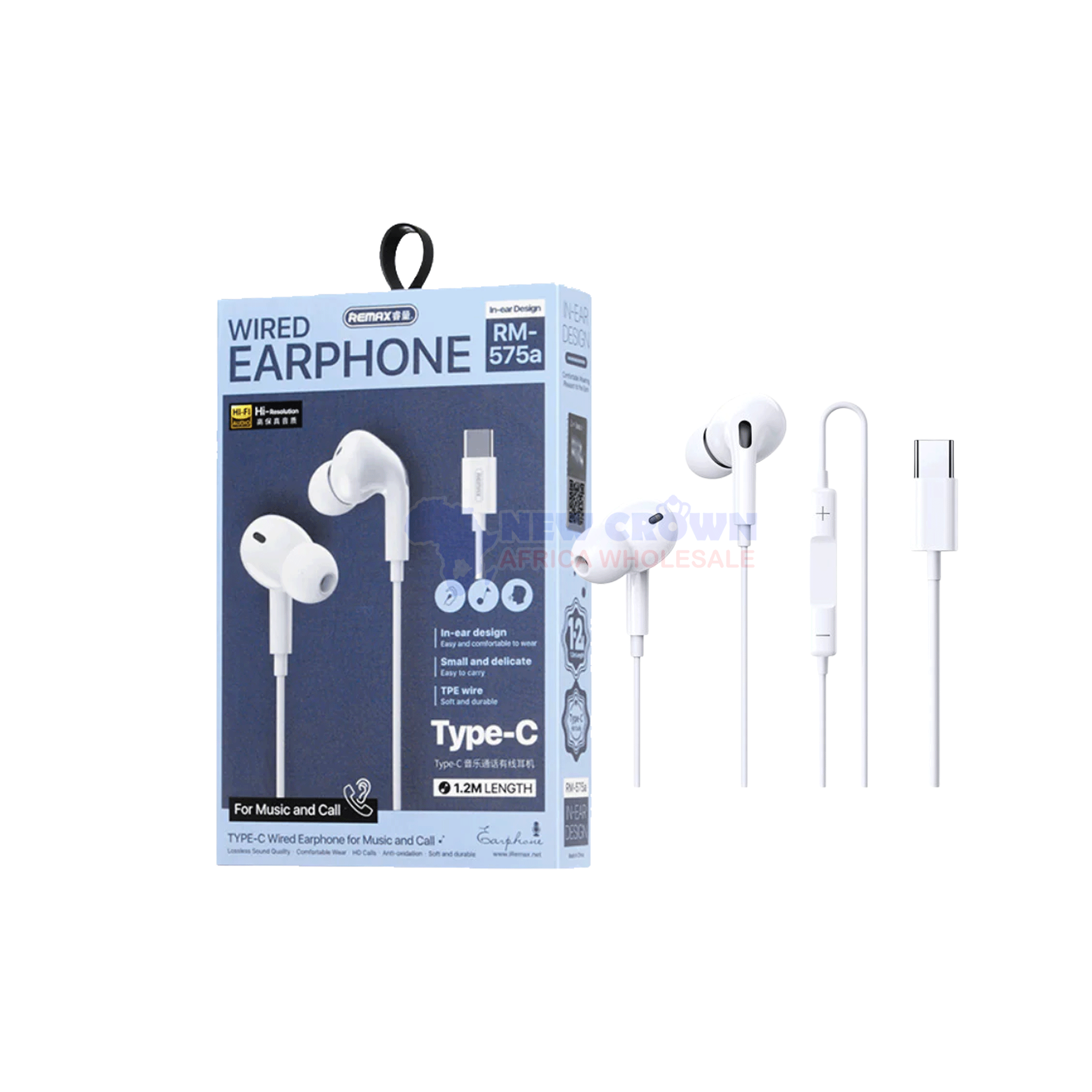 The REMAX RM-575A Type-C Wired Earphones are designed for clear, immersive sound and wide compatibility with modern USB-C smartphones and devices. With a built-in microphone, in-line controls, and premium construction, these earphones are ideal for B2B wholesalers, tech resellers, and electronics distributors in Botswana, especially in Gaborone.